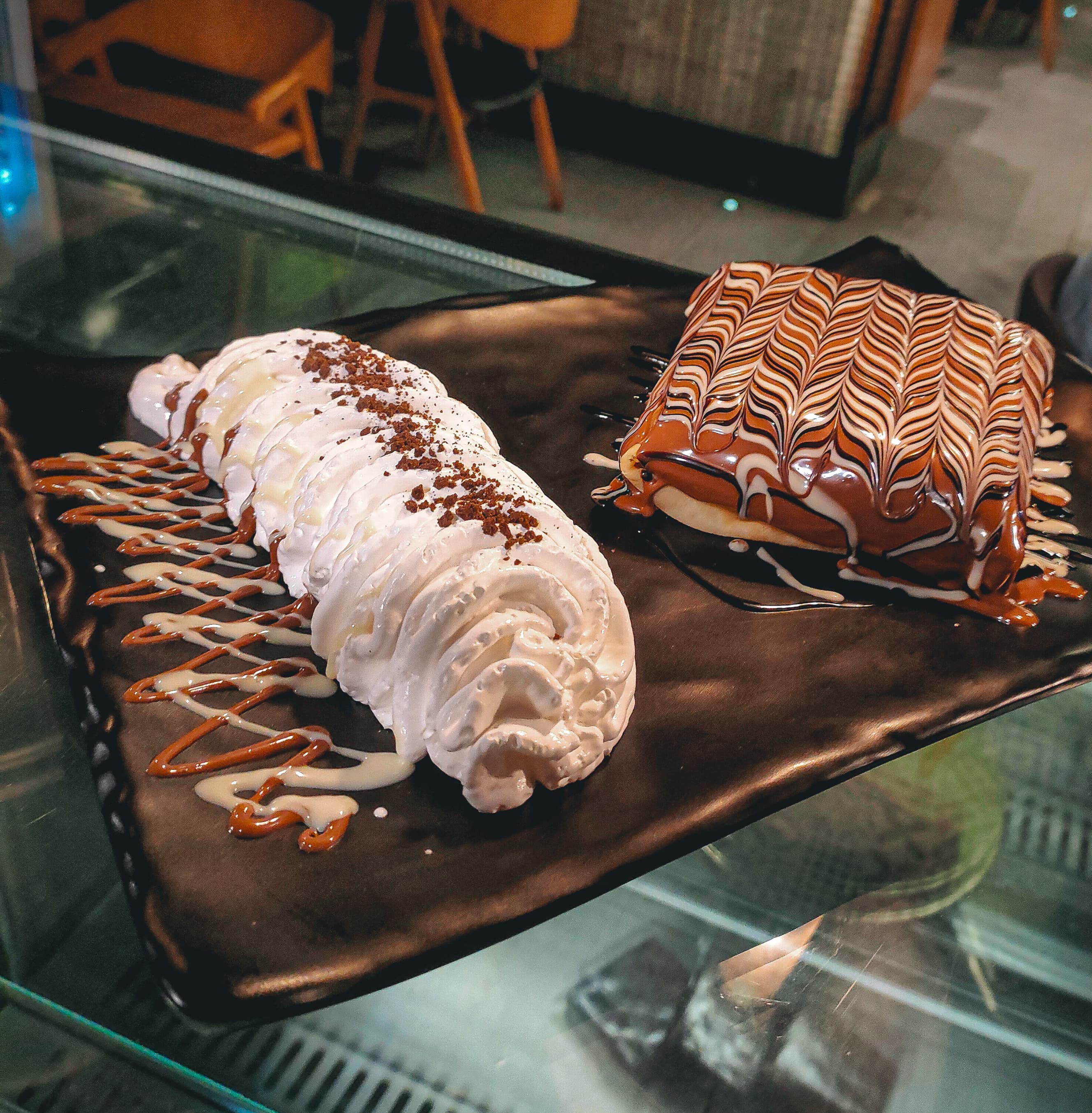 Crepe with fudge brownie filling dipped With king chocolate sauce and nutella sauce Hazelnut with white chocolate sauce
