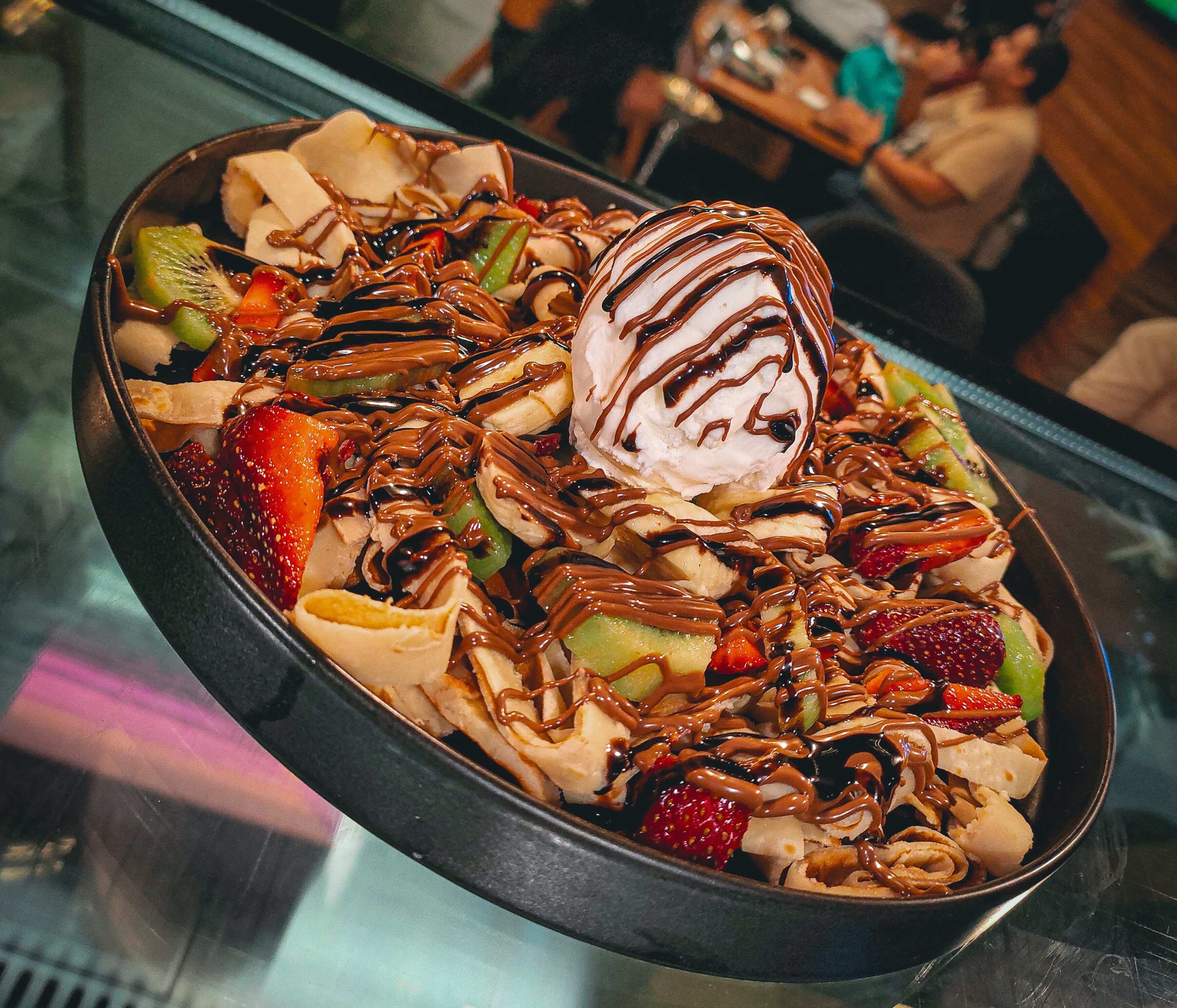Fettuccine crepe slices with mix Of seasonal fruits with ice cream With white chocolate sauce, dark chocolate and nuts