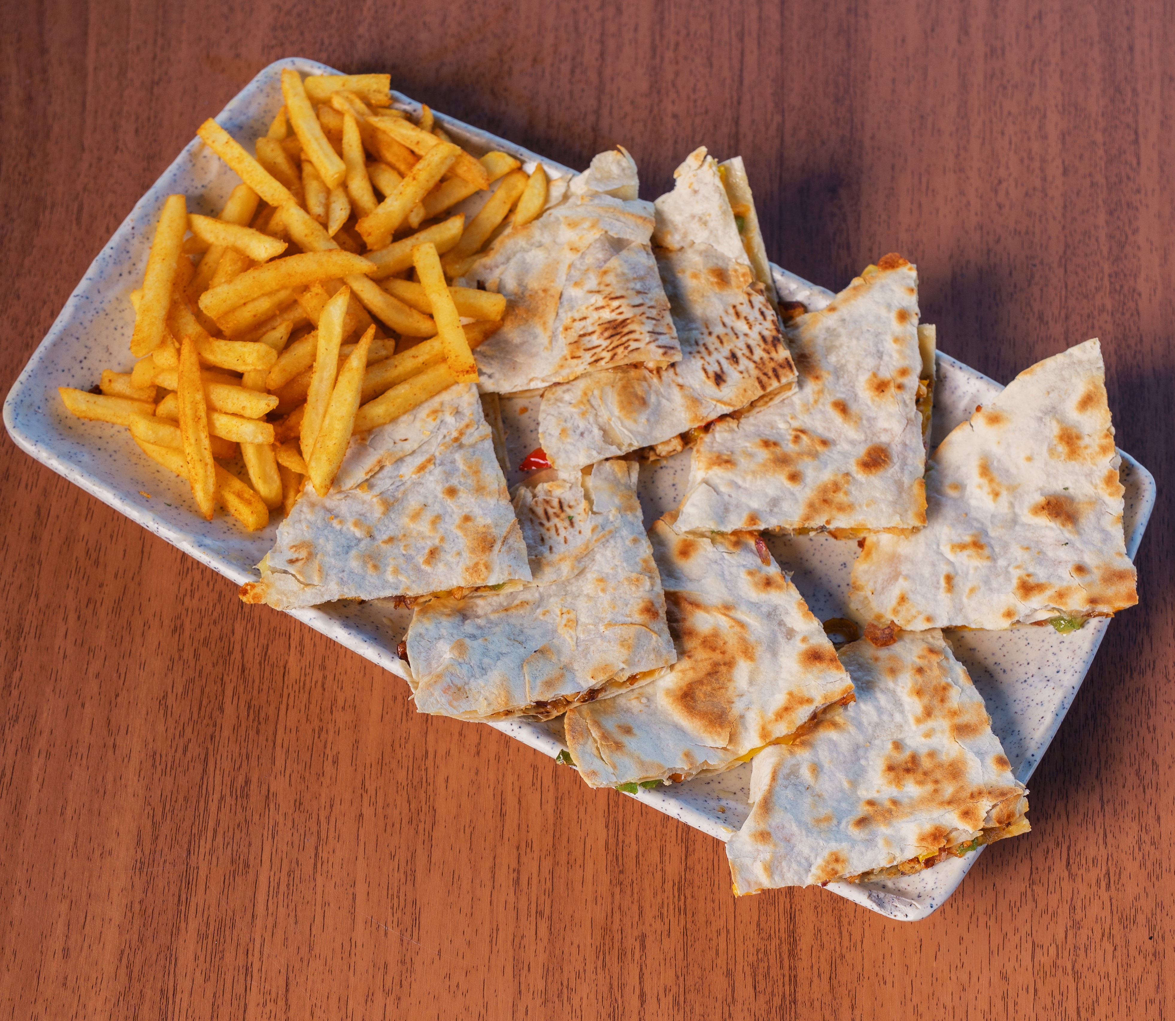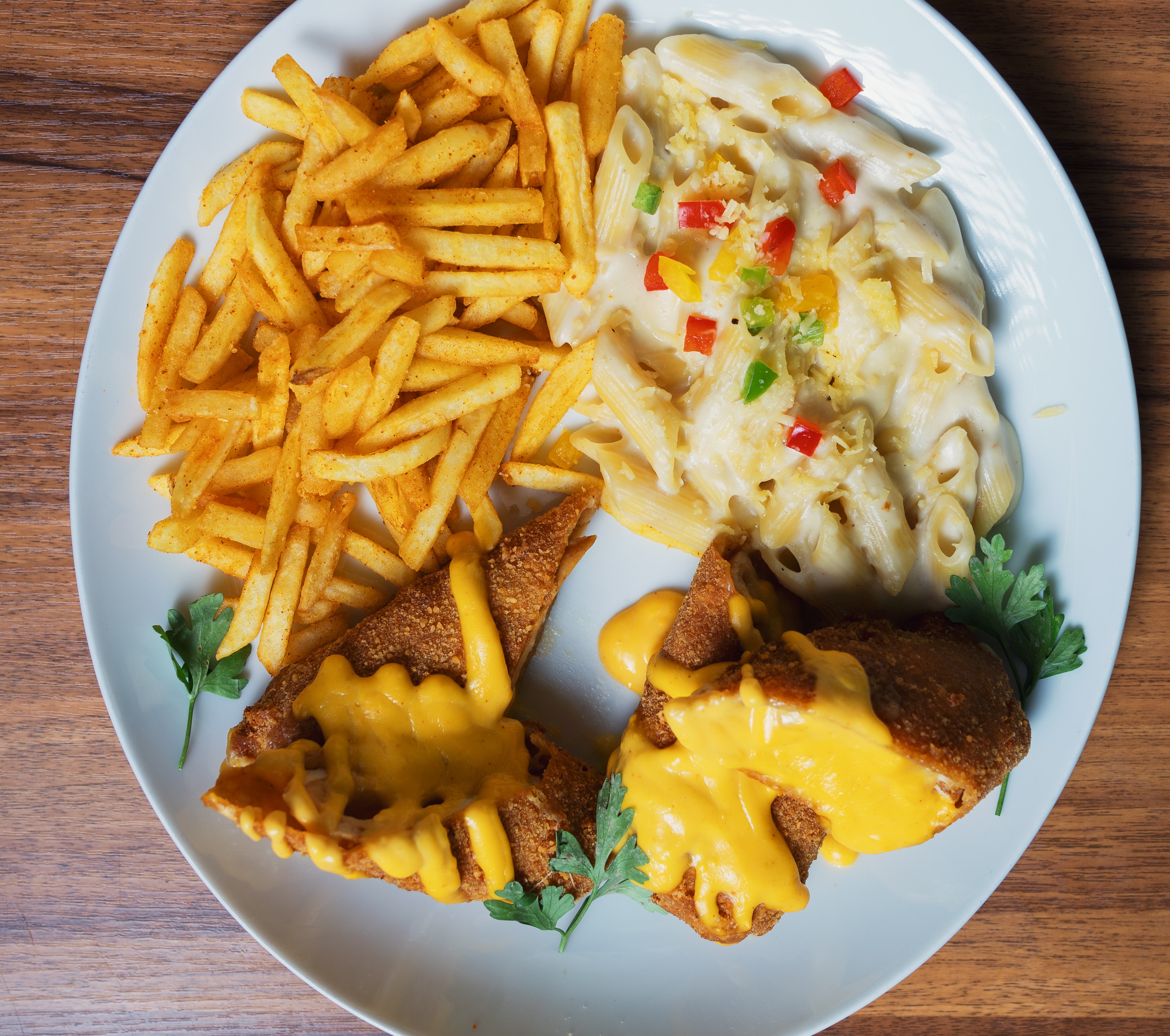 Toasted toast stuffed with mix cheddar served with fries and digs
