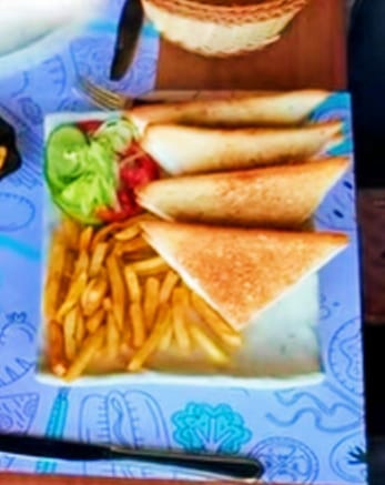 Toast stuffed with feta oregano served with potato wedges